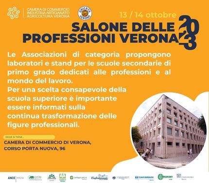 Anche quest'anno Camera di Commercio di Verona e Rete ORIENTAVERONA, in collaborazione con le associazioni di categoria delle imprese scaligere, organizzano la seconda edizione del Salone delle Professioni di Verona, che si terrà venerdì 13 e sabato 14 ottobre 2023 nella sede della Camera di Commercio di Verona in Corso Porta Nuova 96.