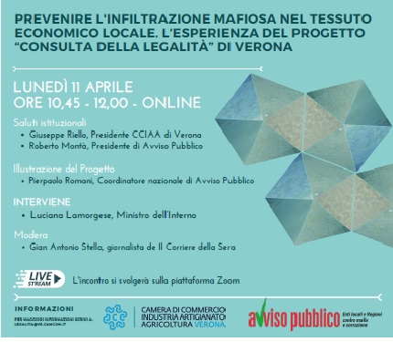 La Consulta della Legalità della Camera di Commercio di Verona ha tra i suoi obiettivi la realizzazione di un percorso formativo che si propone di trattare la conoscenza del fenomeno mafioso e del suo agire, in particolare nel settore economico, e la presentazione di buone pratiche di contrasto e prevenzione già messe in atto in altri territori dello stato italiano.
