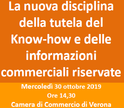 Lo Sportello Tutela Proprietà Intellettuale della Camera di Commercio di Verona organizza, mercoledì 30 ottobre alle 14.30, un seminario per fornire, a professionisti e imprese, un aggiornamento sulle novità introdotte dal d.lgs. 63/2018 a tutela del know-how e dei segreti commerciali.