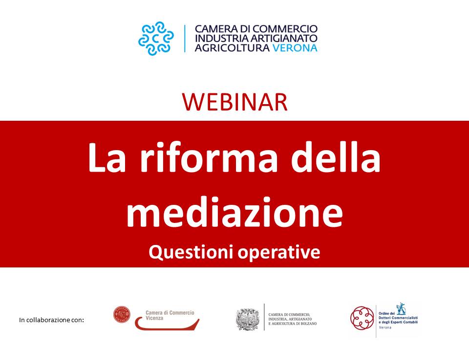 La Camera di Commercio di Verona, in collaborazione con le Camere di Commercio di Vicenza e Bolzano e con l'Ordine dei Dottori Commercialisti ed Esperti Contabili di Verona, organizza un webinar per approfondire le ricadute operative delle disposizioni che, nel corso del 2023, hanno modificato la mediazione civile e commerciale.