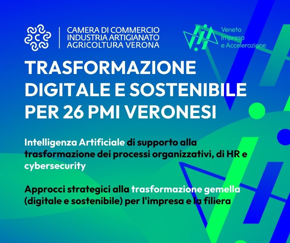 La Camera di Commercio di Verona, in collaborazione con Unioncamere del Veneto e l'Università di Verona, Padova e Venezia propone un progetto per accompagnare 26 imprese veronesi verso la doppia transizione digitale e sostenibile, con un focus specifico sull'Intelligenza Artificiale.