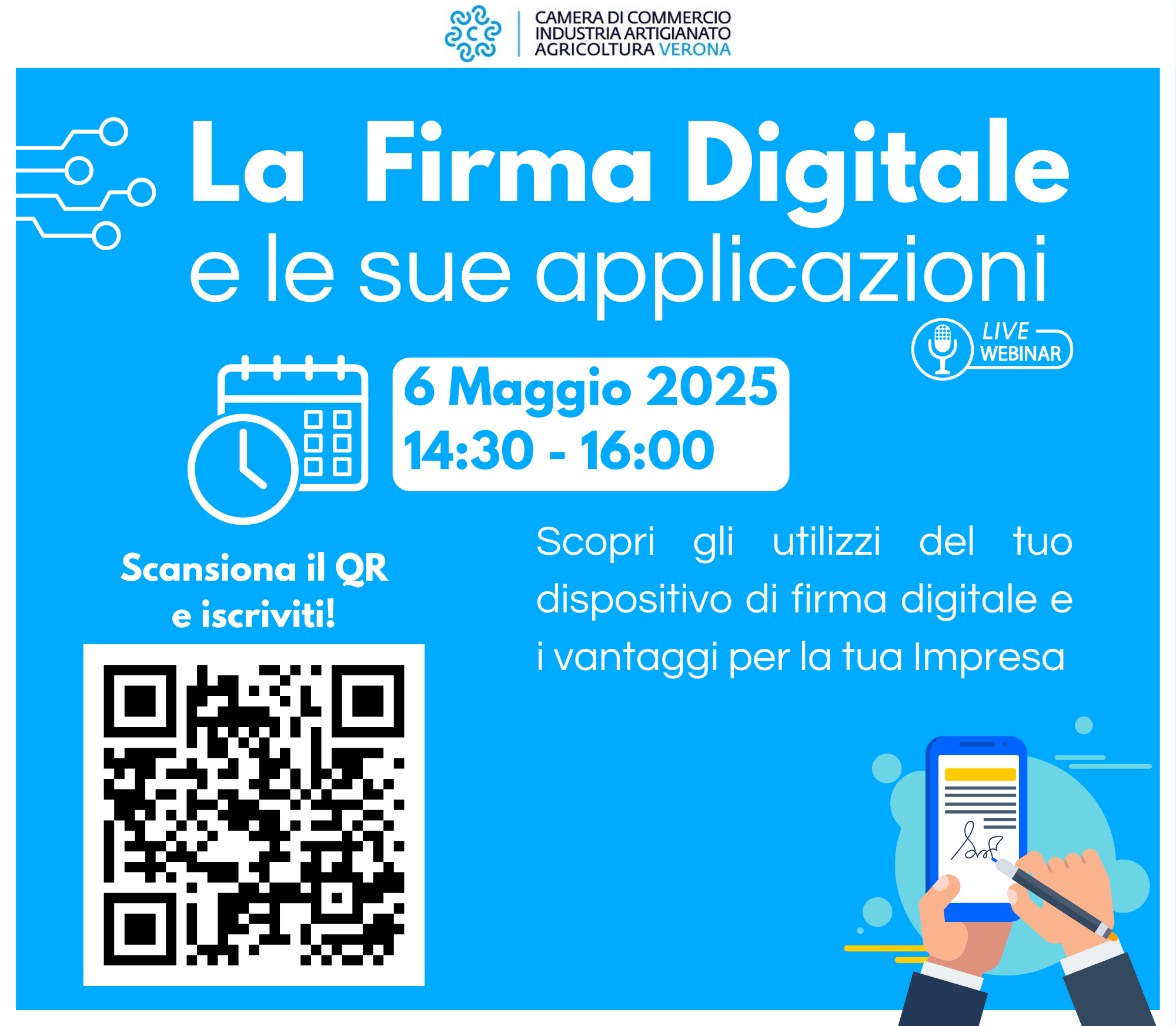 La Camera di Commercio di Verona organizza un webinar gratuito per imprenditori e professionisti del territorio per approfondire la normativa alla base del rilascio dei dispositivi di firma digitale, le modalità di utilizzo e le varie tipologie di firma offerte.
