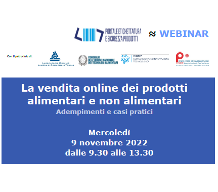 Il Laboratorio Chimico Camera di Commercio di Torino organizza, in collaborazione con gli enti del Sistema Camerale (Camere di commercio, Unioni regionali, aziende speciali del territorio) aderenti al Portale Etichettatura e Sicurezza Prodotti, il webinar "La vendita online dei prodotti alimentari e non alimentari - Adempimenti e casi pratici" il 9 novembre 2022 dalle 9.30 alle 13.30.