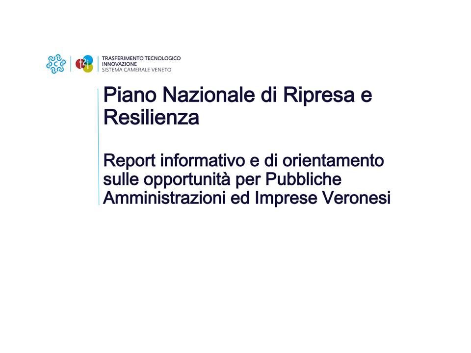 Si pubblica di seguito il Report elaborato da T2i - Trasferimento tecnologico e innovazione per conto della Camera di Commercio di Verona, finalizzato ad informare pubbliche amministrazioni ed imprese sulle opportunità offerte dal Piano Nazionale di Ripresa e Resilienza.