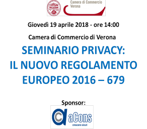Il Seminario Privacy, il nuovo Regolamento Europeo 2016-679 si terrà giovedì 19 aprile dalle 14,30 nel nuovo Centro Congressi della Camera di Commercio, in Corso Porta Nuova 96 a Verona. Il convegno è organizzato in collaborazione con Acons, i cui legali approfondiranno il tema. Il regolamento coinvolge chiunque abbia a che fare con dati personali e prevede nuovi obblighi per le imprese indipendentemente dal numero di dipendenti. Le norme si applicano a tutte le imprese dell’Unione Europea. Imprese ed enti avranno più responsabilità e in caso di inosservanza delle regole rischiano pesanti sanzioni, fino al 4% del fatturato annuo o a 20 milioni di euro. Per la partecipazione al convegno l'Ordine degli Avvocati e quello dei Dottori Commercialisti riconoscono 3 crediti formativi. La partecipazione è gratuita è sufficiente iscriversi al seguente link: http://www.vr.camcom.it/it/attivita/privacy-il-nuovo-regolamento-europeo.